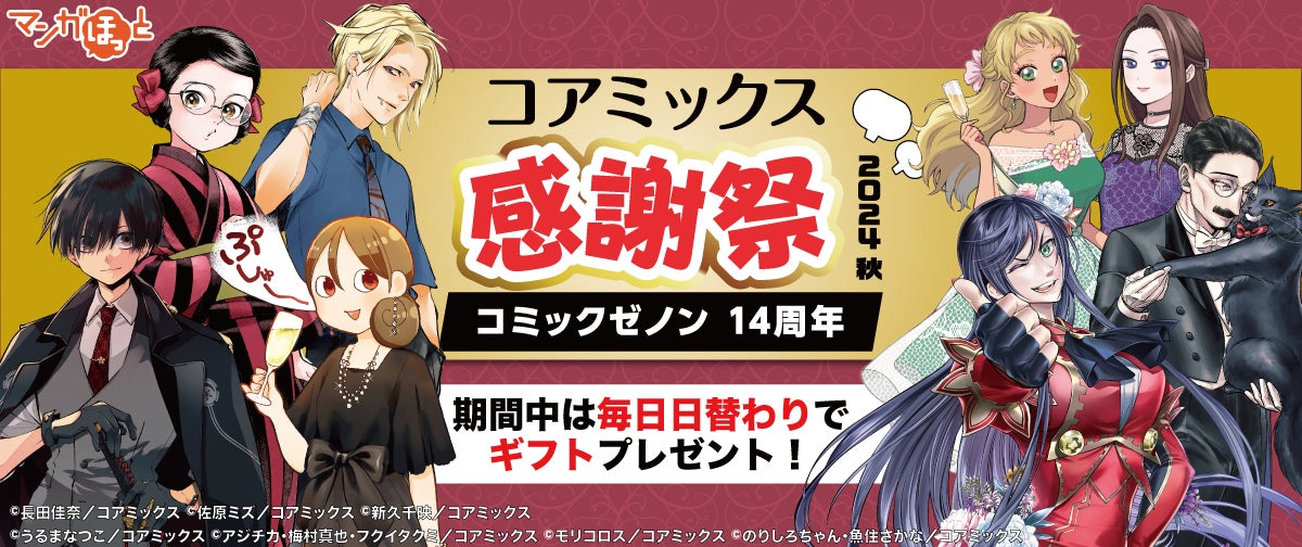 コアミックス公式マンガアプリ「マンガほっと」では、月刊コミックゼノン創刊14周年を記念し、11月1日~30日までの期間、日替わりでギフト券を配布するフェアを開催する。