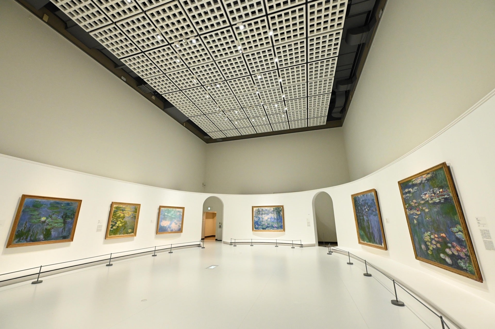 モネが描いた「睡蓮」と言えば、パリのオランジュリー美術館の大装飾画「睡蓮の間」が有名ですが、今回はその展示室を彷彿とさせるような楕円形の空間も、大きな見どころのひとつです。2メートルを超える大画面の「睡蓮」に囲まれて、モネの世界に、どっぷりと浸れます。実はモネが睡蓮の大装飾画に取り組んでいた時代は、第一次世界大戦の真っただ中でもありました。知人や家族が次々と戦地に送られていく中、モネは黙々と創作に没頭していきました。展覧会の最後を飾る2つの大作は、まさに第一次世界大戦中に描かれていたもの。