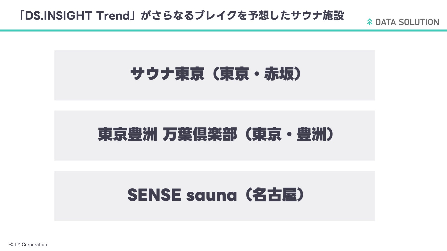 「DS.INSIGHT」の急上昇トピックやトレンドをAIが可視化する「DS.INSIGHT Trend」機能を使用し、検索数の伸びから今後のブレイクが期待できるサウナ施設をピックアップしました。