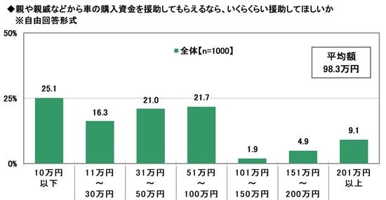 さらに、親や親戚などから車の購入資金を援助してもらえるなら、いくらくらい援助してほしいかを聞いたところ、「10万円以下」(25.1%)や「31万円〜50万円」(21.0%)、「51万円〜100万円」(21.7%)との回答が多くなったほか、「201万円以上」(9.1%)にも回答がみられ、平均額は98.3万円でした。