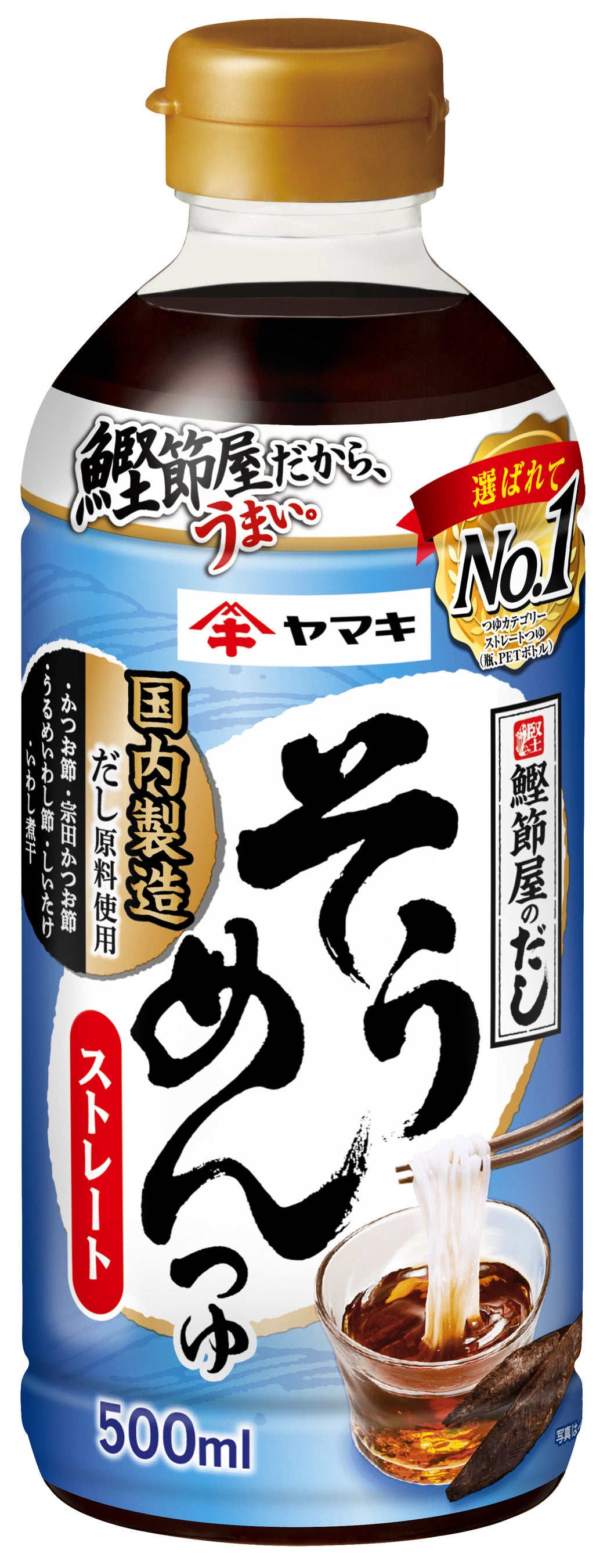 「ストレートそうめんつゆ500ml」は、かつお節、宗田かつお節、うるめいわし節、しいたけ、いわし煮干をブレンドしたストレートつゆです。後味にしっかりしたうま味とだしの余韻があり、食べ進めてもつゆが「薄まった」と感じにくい品質で多くの方からご好評をいただいている、ストレートつゆ市場で購入金額シェアがNo.1(※3)の商品です。
