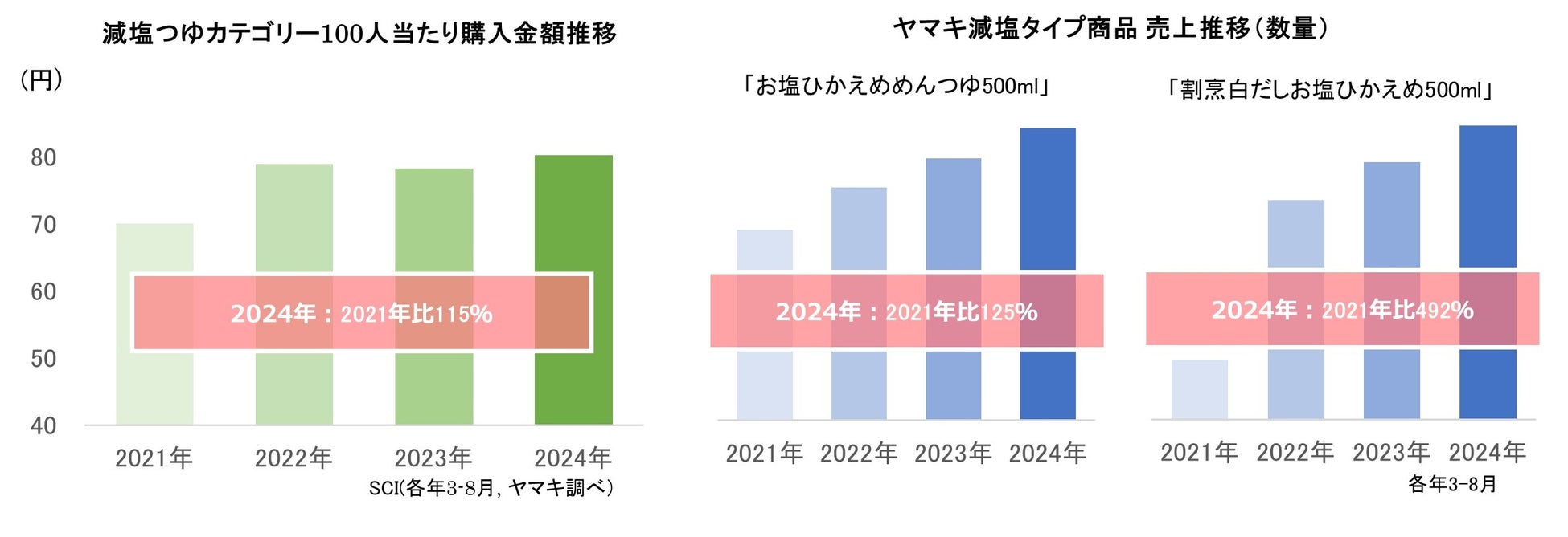 近年の健康志向の高まりにより、日々の食卓で「減塩」を意識する方が増えており、つゆカテゴリーにおける減塩関連商品の購入金額も着実に伸長しています。
