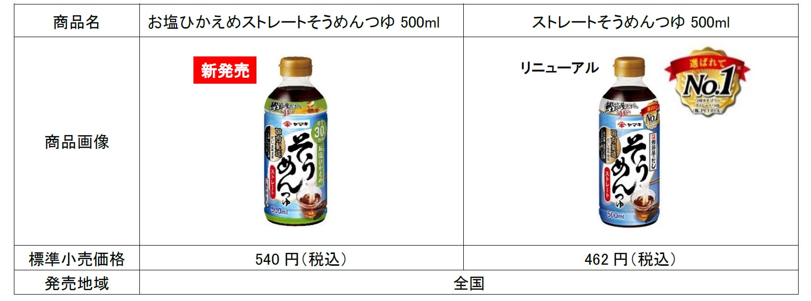 ヤマキ株式会社(本社:愛媛県伊予市 代表取締役社長:城戸善浩 以下ヤマキ)は、昨年発売40周年を迎えた「ストレートそうめんつゆ500ml」の姉妹品として、塩分を30%カット(※1)した「お塩ひかえめストレートそうめんつゆ500ml」を新発売します。