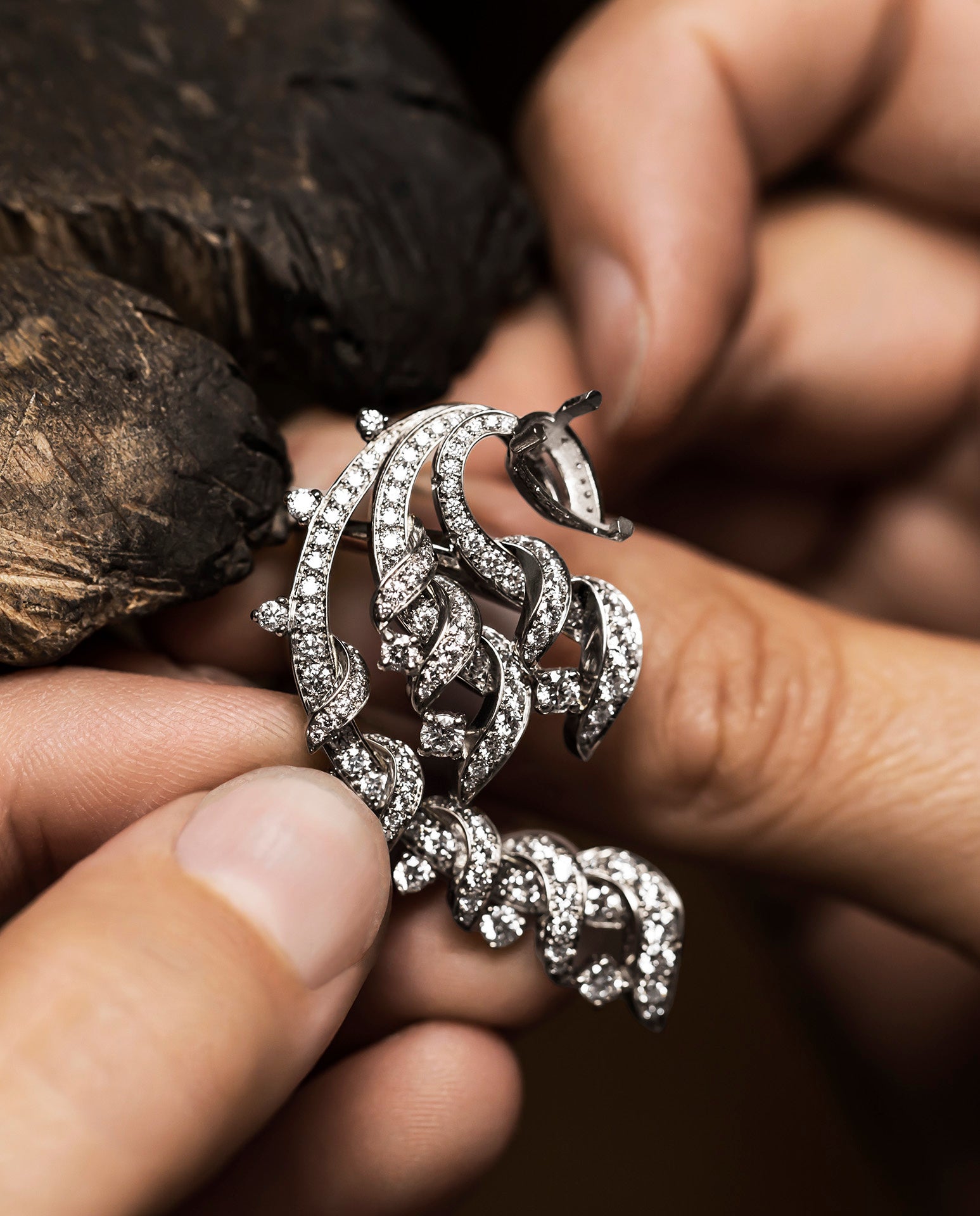 オールホワイトダイヤモンドの透明さと純粋な輝きを引き立てる「ビアンコ ブリランテ」チャプターは、卓越したハイジュエリーのタイムレスな表現を創造する「フェンディ トリプティック」コレクションのフェミニンなスタイルを体現しています。ケージ構造をきらきらと輝くセカンドスキンメッシュに進化させた、メンズとウィメンズの両方を想定した連結式のポートレートネックレスには、首の周囲で次第に細くなるモザイクの「FF」ロゴモチーフ内に、オーバルカットのダイヤモンドが散りばめられています。そのドラマティックなクレッシェンドは、優雅なチェーンブレスレットとオーバルカット、またラウンドダイヤモンドに彩られた、反転した「FF」ロゴダイヤモンドモチーフイヤリングにも用いられています。