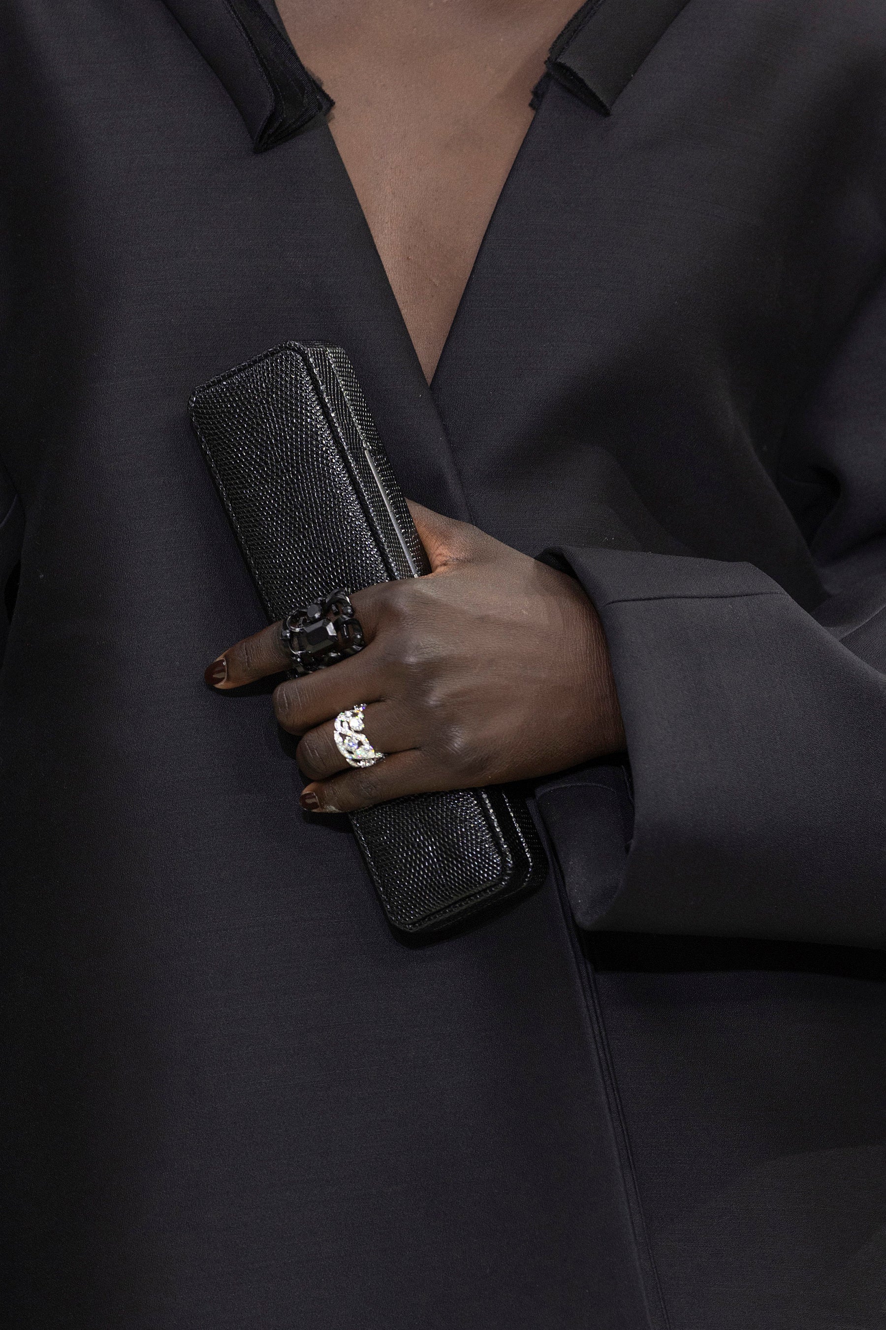 もう一つのオールホワイトのジュエリーは、大きなブリリアントカットとペアシェイプのダイヤモンドがまるで朝露のようにあしらわれ、ループ状の「FF」ロゴシェイプで構成された円形のネックレスで、フック構造として「FF」ロゴモチーフのパワーが利用されています。このらせん状のフォーメーションはいくつものブリリアントカットダイヤモンドが散りばめられ、ペアカットダイヤモンドが吊り下げられた「FF」ロゴから作られるエアリードロップイヤリングへ続き、フックの付いた「FF」ロゴモチーフと対話する、ツイストしたダイヤモンドがあしらわれたアシンメトリーリングにも用いられています。絡み合った「FF」ロゴフォームの最終的なジェスチャーが、ダブルペイブドストランドと交互に現われるウィスパリングシェイプのようにグラフィックな線形のリングとイヤリングを彩り、フェンディの真髄ともいうべきアイコンを繊細で揺らめくように表現しています。