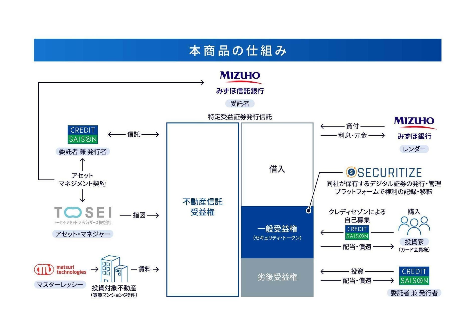 株式会社クレディセゾン(代表取締役(兼)社長執行役員COO:水野 克己、以下:クレディセゾン)、みずほ信託銀行株式会社(取締役社長:笹田 賢一)、株式会社みずほ銀行(頭取:加藤 勝彦)、トーセイ・アセット・アドバイザーズ株式会社(代表取締役社長:塚田 良之)、Securitize Japan株式会社(代表取締役:ジェームス・エイチ・フィン)は、不動産セキュリティ・トークンを通じて資産形成に繋げる新たな選択肢を提供し、より多くの方々に不動産投資の機会を広げるべく、協業を開始いたします。本協業の取り組みとして、クレディセゾンは、セゾンカード・UCカードの会員様を対象に、日本初※のクレジットカード会社による公募(自己募集)型不動産セキュリティ・トークン「セゾンのスマート不動産投資」(以下:本受益権)を発行いたします。