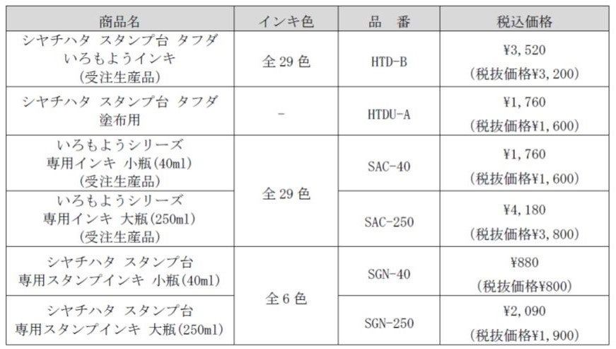 ユーザーファーストを追求し次の100年も「しるしの価値」を提供し続けるシヤチハタ株式会社※(代表取締役社長 舟橋 正剛 本社:愛知県名古屋市)は、この度、記念品スタンプやスタンプラリーなどで便利に使える大型のスタンプ台として好評の「シヤチハタ スタンプ台 タフダ」に、日本の伝統色から選定した「いろもよう」シリーズのインキを採用した「シヤチハタ スタンプ台 タフダ いろもようインキ」を2024年8月1日(木)より受注開始します。また、好きな色のインキを塗布してご使用いただける「シヤチハタ スタンプ台 タフダ 塗布用」を2024年8月1日(木)より発売します。