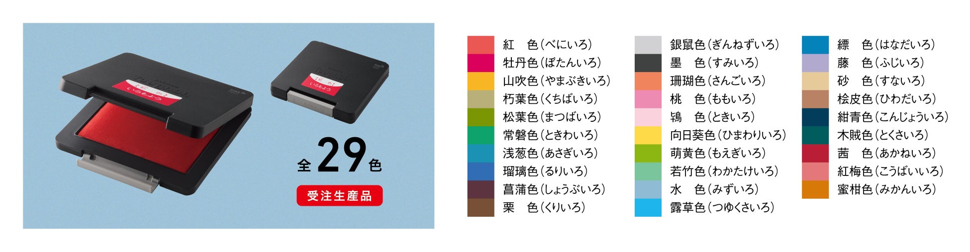 日本の伝統色から選定した「いろもよう」シリーズのインキを採用した大型スタンプ台です。インキ色は全29色。
