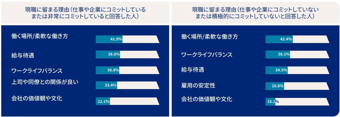 勤務先に留まることを決めた従業員について見てみると、柔軟な勤務形態が会社に留まる重要な要因であるというのが一致した回答であり、給与の問題よりも順位が高くなっています。さほどやる気があるわけではない従業員の間では、雇用の安定性の高さも会社に留まる大きな動機となっていることが分かり、今後の経済と雇用の安定性に関する控えめな見方と一致した結果となっています。