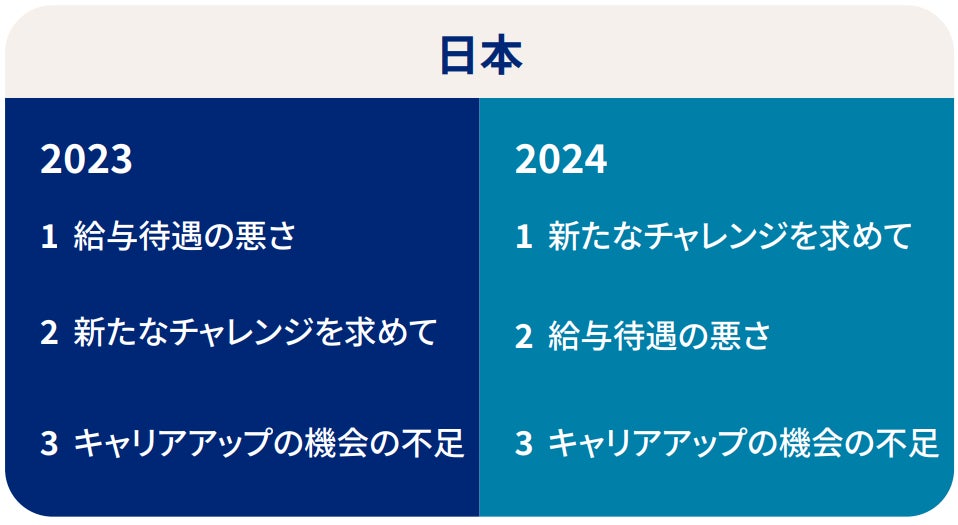 2023年後半に6週間にわたって実施した本調査では、今後12か月以内の転職を考えている従業員に、現在の勤務先を辞めようと思った最大の理由を3つ挙げてもらいました。その結果、新たな挑戦をしたいという思いが、給与の低さを抑え、退職理由のトップとなりました。2022年に実施された同様の調査では、給与の低さが従業員が現在の勤務先を辞めることにした第一の理由となっていました。