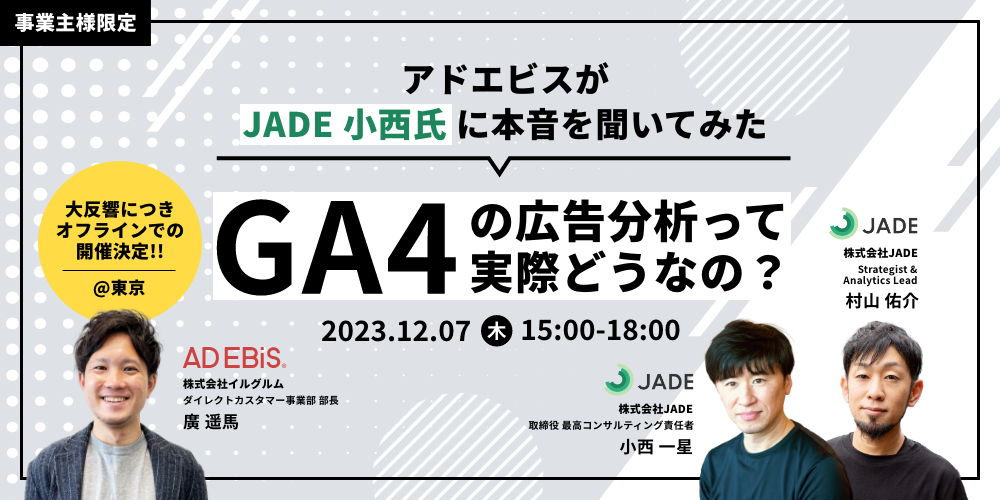 株式会社イルグルム(本社:大阪府大阪市北区 代表取締役:岩田 進、以下「イルグルム」)が提供する広告効果測定プラットフォーム「アドエビス」は、Webコンサルティング事業を展開する株式会社JADE(本社:東京都千代田区 代表取締役社長:伊東 周晃、以下「JADE」)と、GA4の広告分析に関する本音を赤裸々に語る無料オフラインセミナーを2023年12月7日(木)に開催することをお知らせいたします。