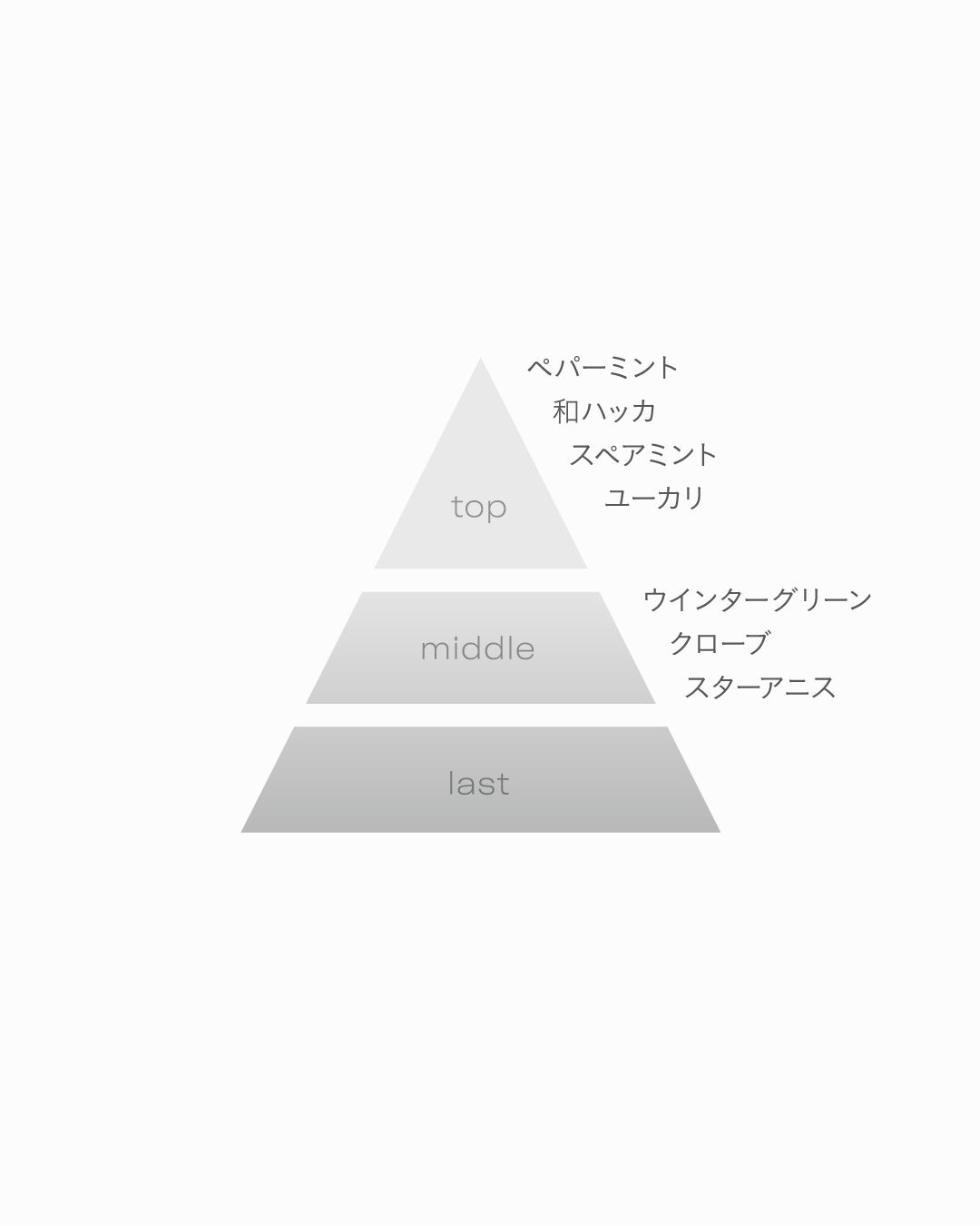 フレッシュなペパーミントにスッとする和ハッカ、甘みのあるスペアミントの3種のミントをブレンドし、清々しいウインターグリーンを加えた香りは、すっきり爽快な印象。自然由来のミントの香りが爽やかに広がると、日差しの強い夏空の下も一瞬で涼風が吹き渡るような心地よい空間に。