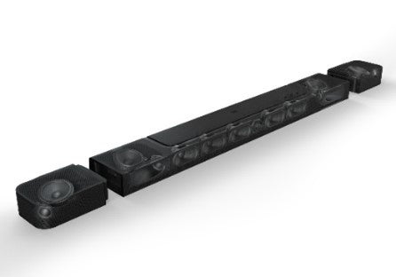 サウンドバー部に2ウェイ構成のセンター/レフト/ライト用スピーカー6基とサラウンド用ビームフォーミングスピーカー2基、ハイトスピーカー2基を搭載。ワイヤレス・リアスピーカーには、リアチャンネルスピーカーとハイトリアスピーカー2基をそれぞれ搭載し、ワイヤレス・サブウーファーに搭載された大口径250㎜ウーファーを含めた、合計15基による贅沢なユニット構成を採用した7.1.4chを実現。