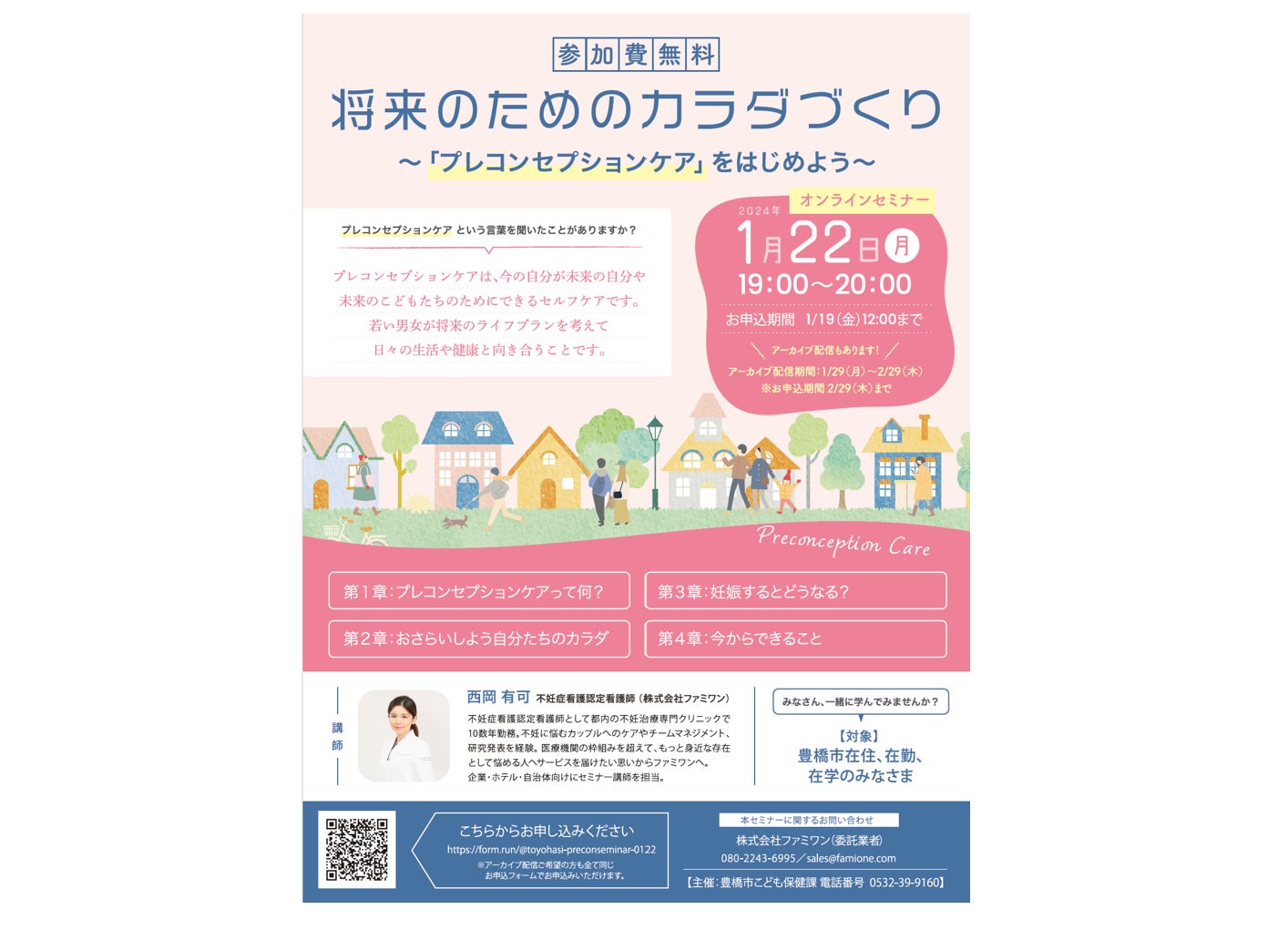 豊橋市在住・在勤・在学の方向けに、「将来のためのカラダづくり~プレコンセプションケアをはじめよう~」と題したプレコンセプションケアに関する知識の啓発セミナーを2024年1月22日に開催します。