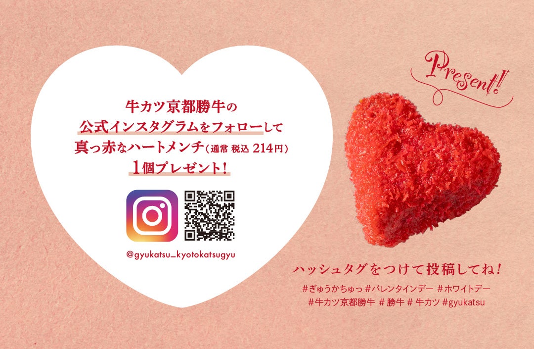 対象期間中、牛カツ京都勝牛の公式Instagramをフォローしていただいたお客様に感謝の気持ちをこめて「真っ赤なハートメンチ~ぎゅうかちゅっ~」を無料でプレゼント!