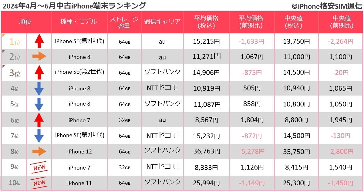 前回の調査(2024年1月〜3月)に引き続き、iPhone 8とiPhone SE(第2世代)の人気は継続していますが、これまで2020年1月〜3月の調査から2024年1月〜3月の調査まで約4年間1位だったiPhone 8をおさえ、iPhone SE(第2世代)が初めて1位に浮上しました。加えて、3位と7位にもiPhone SE(第2世代)が登場。iPhone 8は、iOS17よりアップデートサポートが終了した為、サポート対象な上に高性能かつ安価で購入が可能なiPhone SE(第2世代)へと切り替えたユーザーが一定数いると推測しています。中でも、ランキング1位のau版iPhone SE(第2世代)は、取引数変化率が1番高く、前回調査から60%増となりました。格安SIMや大手ECサイト、中古買取・販売店などが期間限定セールを開催し、前回調査より1,600円程度値下がりし、平均価格15,000円程度となったことが順位上昇の要因と見ています。さらに注目したいのは、8位にランクインしたソフトバンク版iPhone 12と10位のソフトバンク版iPhone 11です。どちらも比較的新しく、機能面が充実した機種でありながら安価である点が支持されていますが、格安SIMや中古スマホショップなどでのキャンペーンにより、平均価格の値下げが続いており、平均価格が下落しています。このまま値下げが続くようであれば、機能性を求めるユーザーの需要がさらに高まり、世代交代が進んでいく可能性も充分に考えられるでしょう。