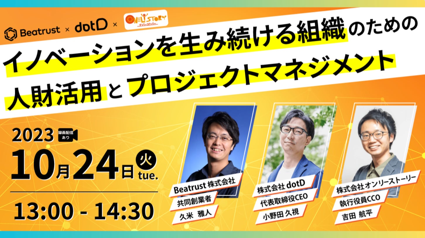 Beatrust 株式会社、株式会社dotD、株式会社オンリーストーリーの3社が共催し、そのイノベーションを生み続ける組織のための人財活用とプロジェクトマネジメントについてお話します。