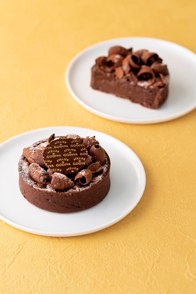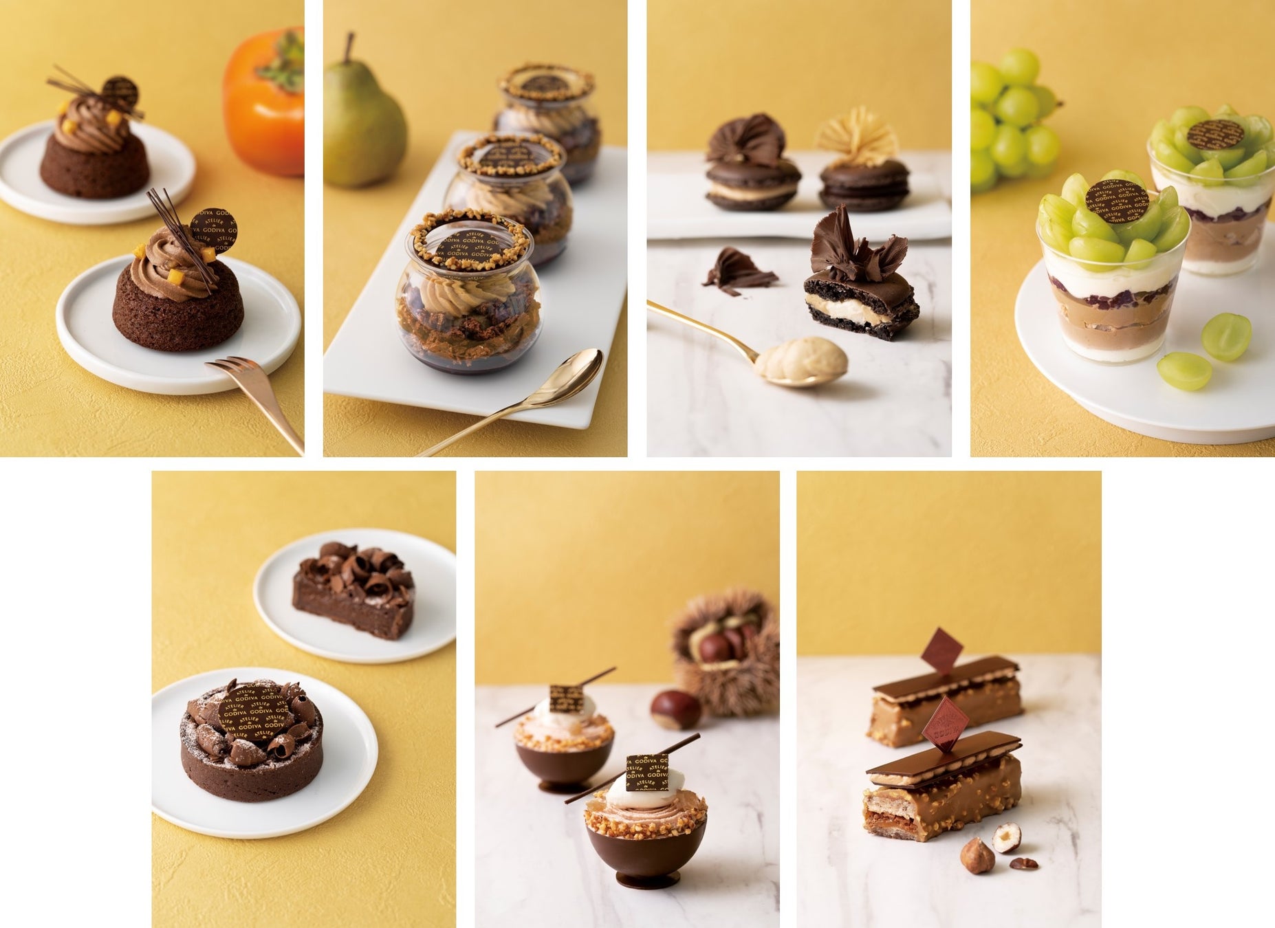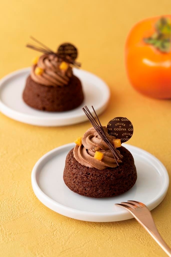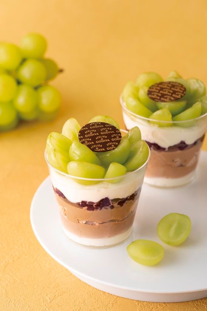 カカオ分55%のダークチョコレートを使用した、甘すぎず、香り高いカカオの風味をしっかりと感じられるチョコレートフィナンシェの中に、フルーツの王国「うきは市」産の柿とマスカルポーネクリームを合わせた「プティガトー ショコラ&柿」、洋梨&カシスのゼリーと、プラリネとアーモンドのクリスピーチョコレートやムースを合わせた「ゴディバ ヴェリーヌ プラリネ&カシス」のほか、カップにぎっしりと詰まったシャインマスカットが贅沢な「アトリエ パルフェ アンポルテ マスカット&ショコラ オ レ」などが登場します。
