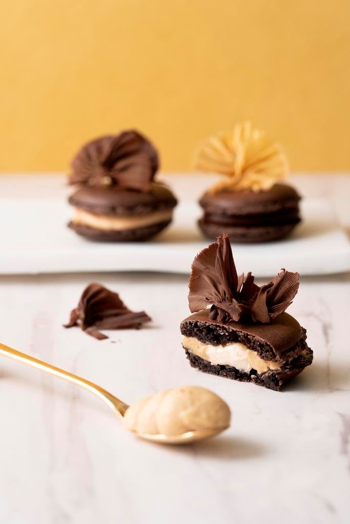 ダークチョコレート&コーヒーと、ホワイトチョコレート&コーヒー、2種類のガナッシュにマスカルポーネクリームを合わせました。コーヒーの苦味が良いアクセントになる、程よい甘さが魅力のティラミスのマカロン。