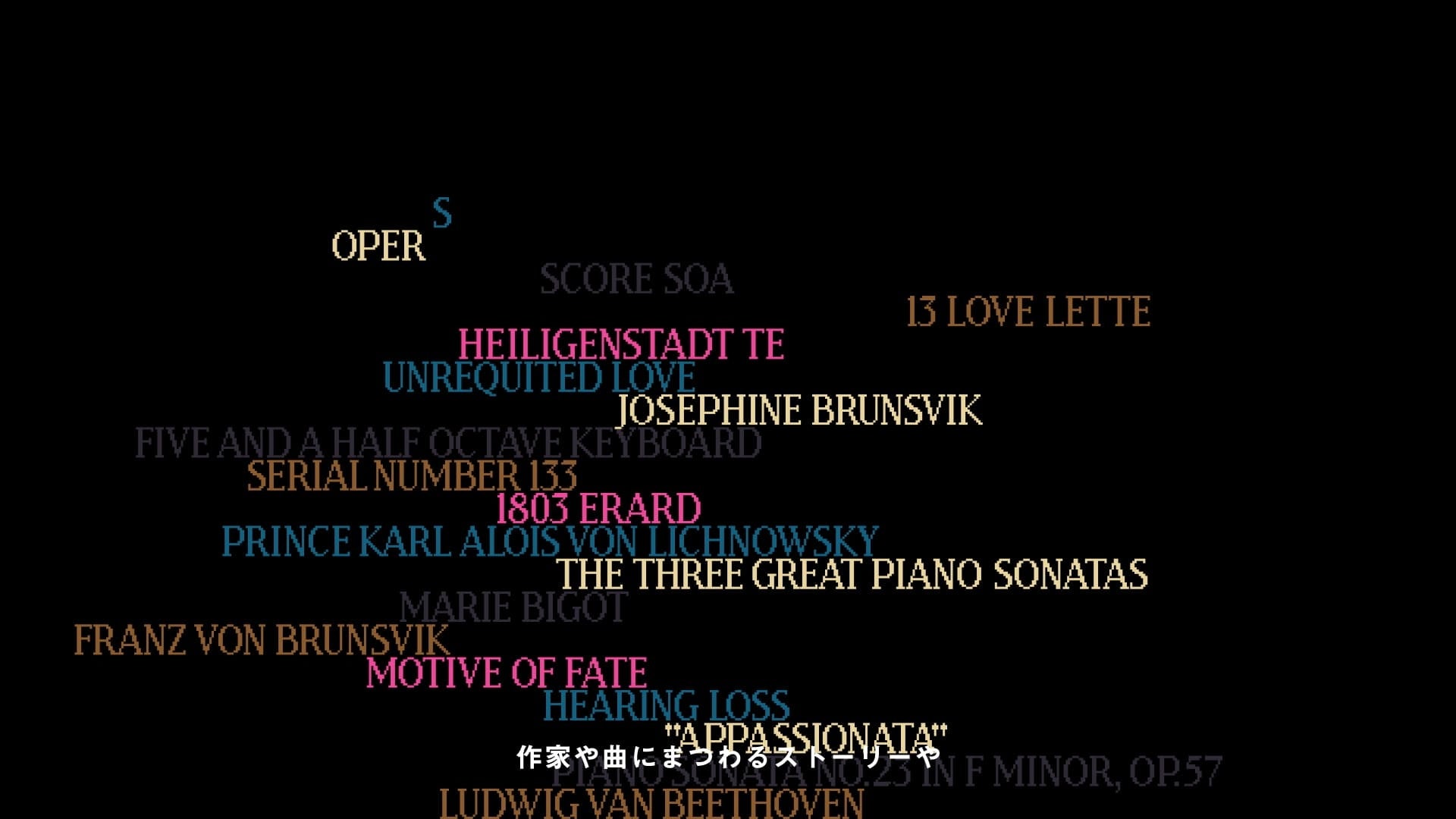 展示内容:ベートーヴェンの「歓喜の歌」「ピアノ・ソナタ第8番『悲愴』第2楽章」「交響曲第5番『運命』第1楽章」「エリーゼのために」をテーマにしたアート作品、音を色に変換するファッションアイテムなど