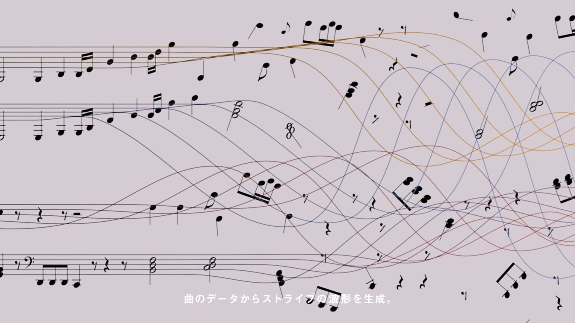 StripeTrackは、あらゆる音楽ジャンルで活用できるシステムです。今回の展示会では、クラシック音楽の巨匠ベートーヴェンを題材にしています。「歓喜の歌」「ピアノ・ソナタ第8番『悲愴』第2楽章」「交響曲第5番『運命』第1楽章」「エリーゼのために」という、ベートーヴェンの名曲から生成されたストライプ柄のファッションアイテムやアート作品が展示され、来場者は音楽と視覚がシンクロする瞬間を体験します。