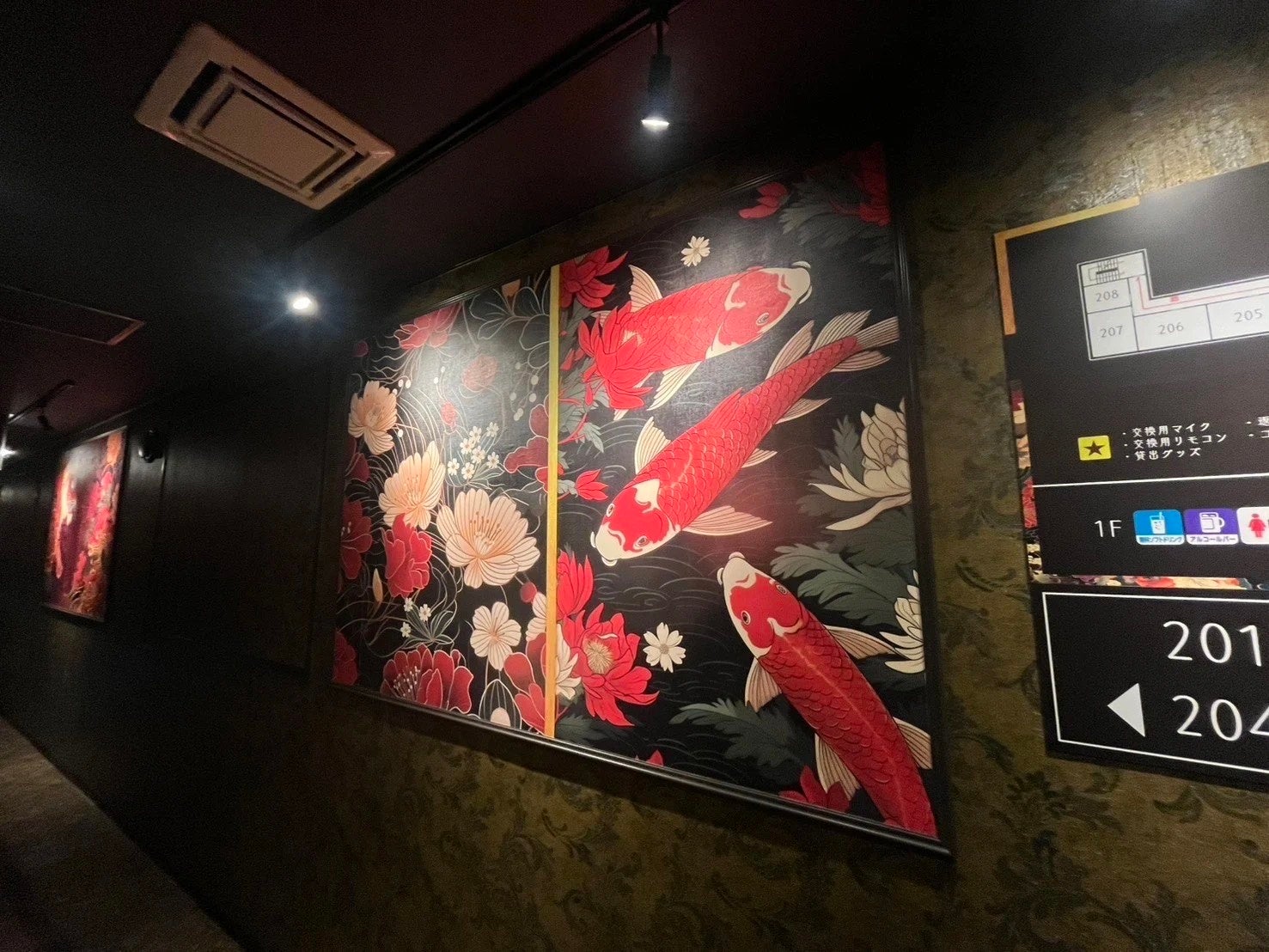 お寺を模したネオンや和柄の装飾が情緒的で非日常的な空間を演出し、特別な雰囲気の中でカラオケをお楽しみいただけます。