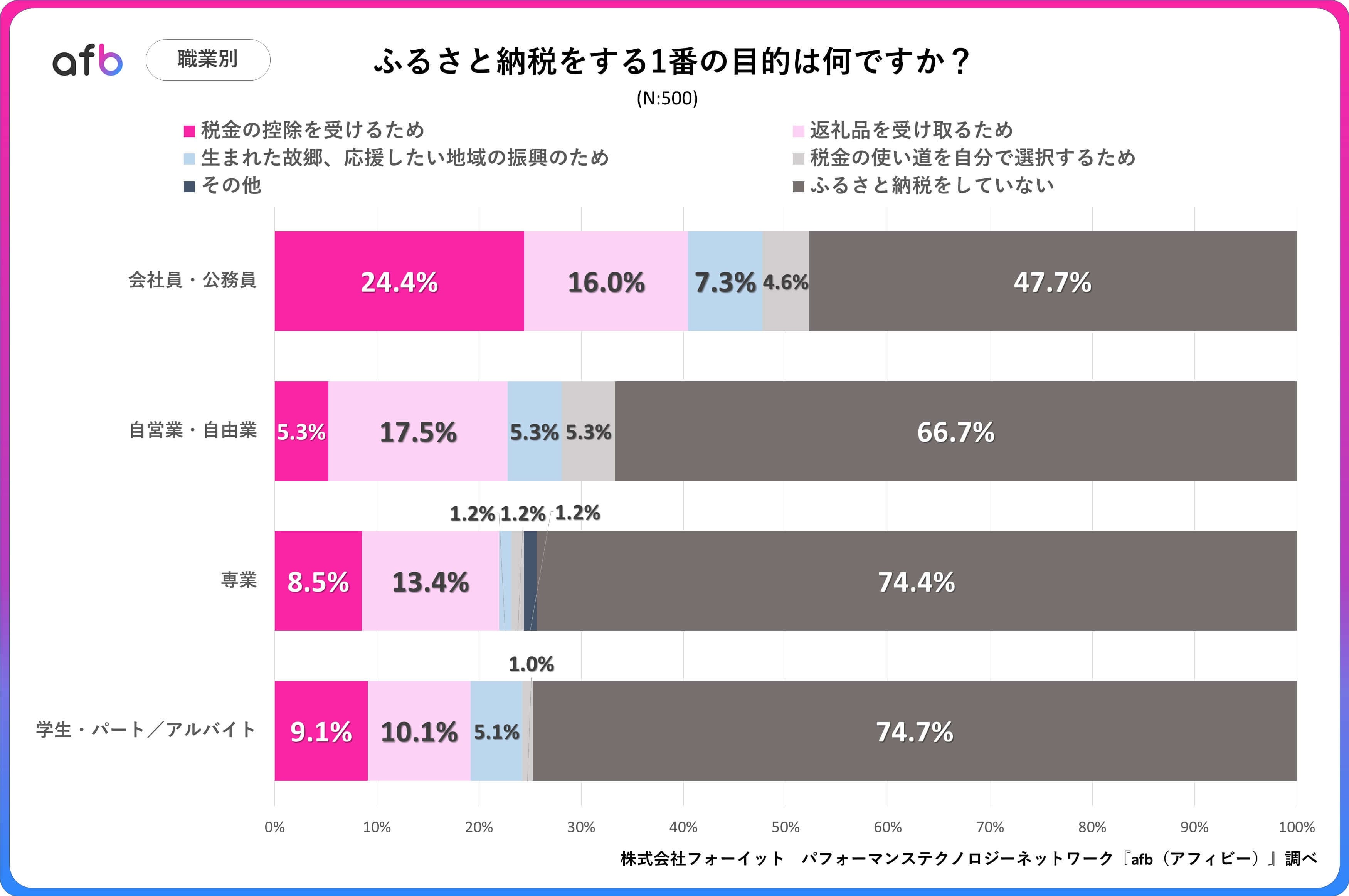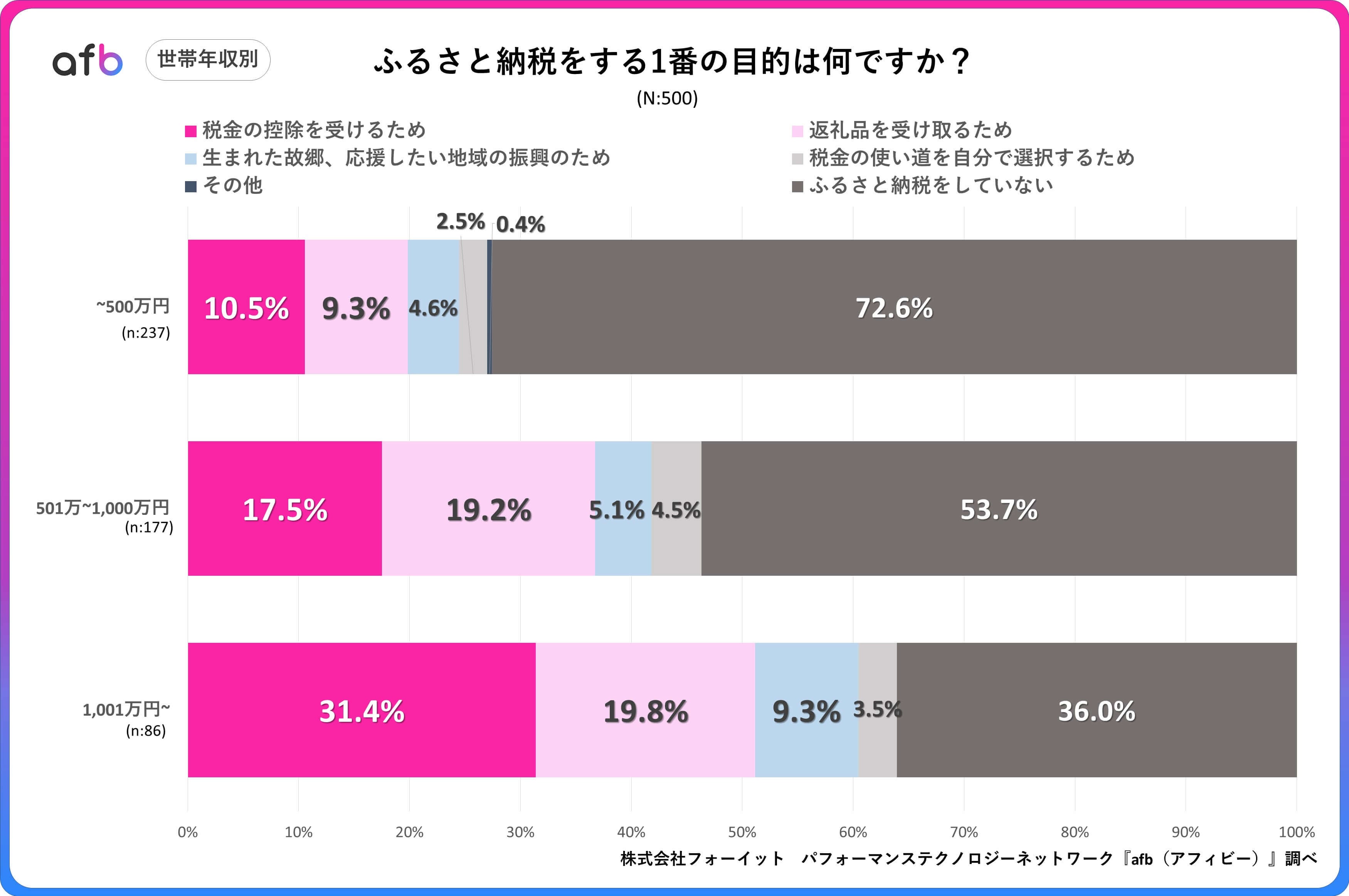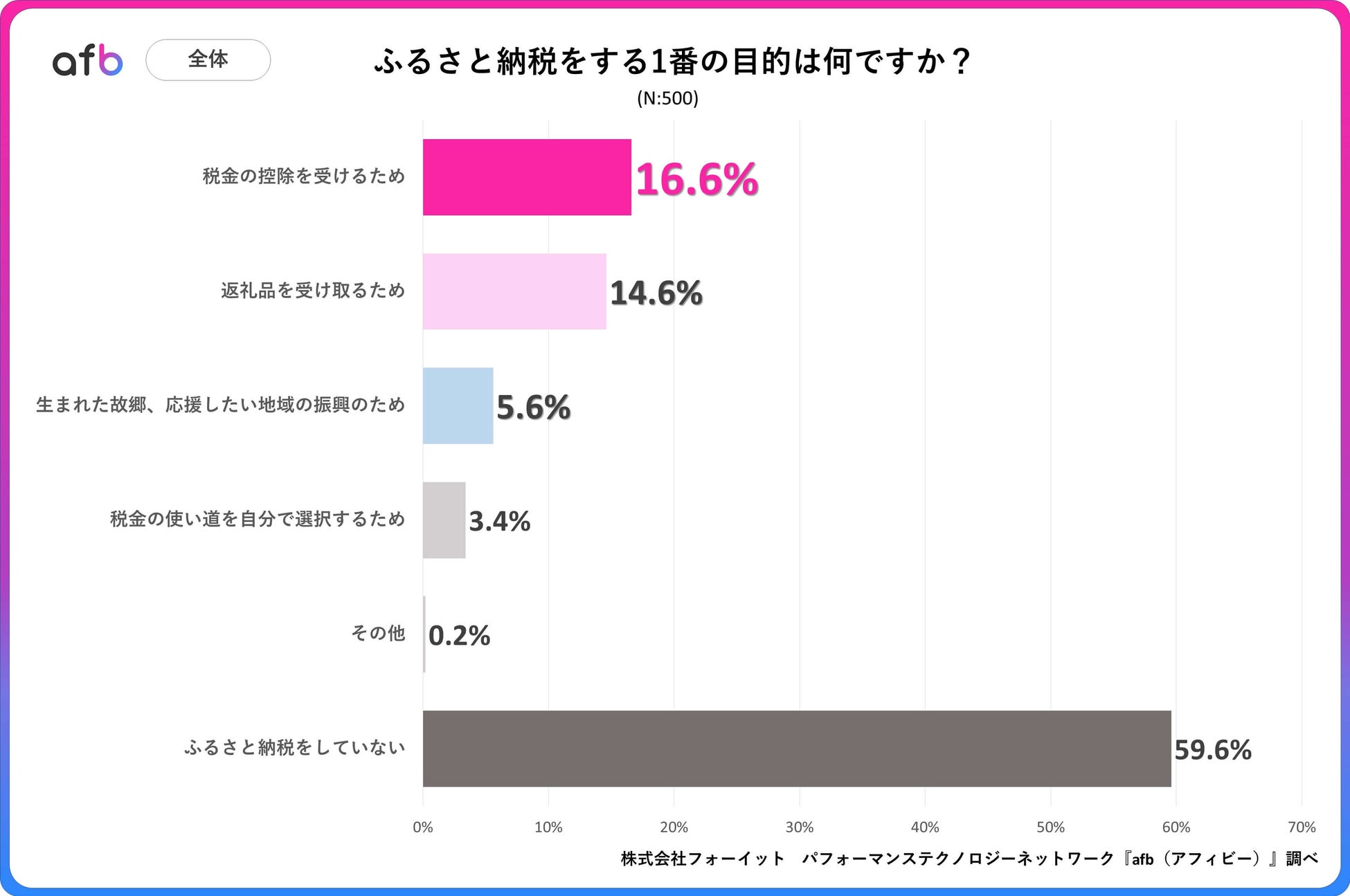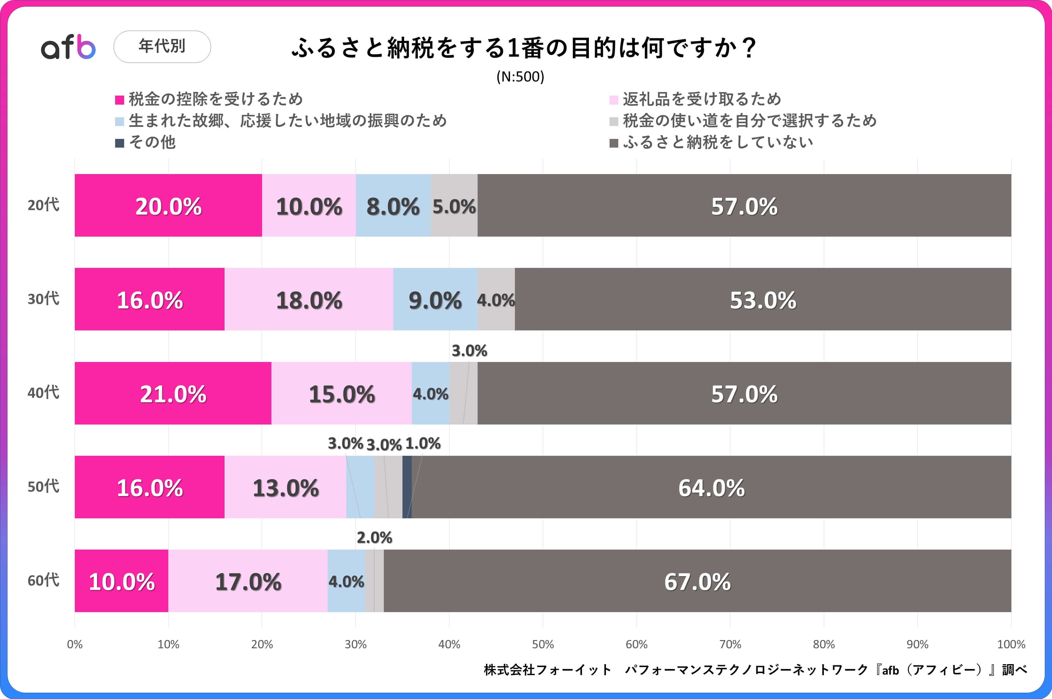 パフォーマンステクノロジーネットワーク「afb(アフィビー)」< https://www.afi-b.com/ >の開発運用をおこなう株式会社フォーイットは、全国の20代~60代までの男女500人を対象にふるさと納税に関するアンケートを実施し、年代別・男女別等の特徴についてまとめました。