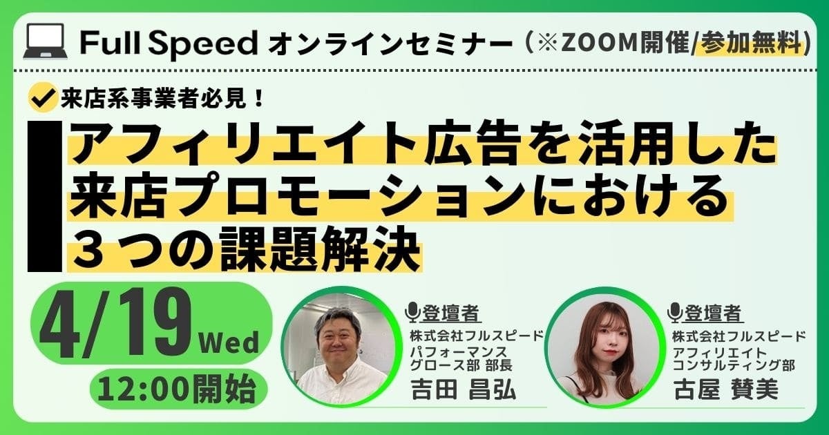 4月19日(水)、株式会社フルスピードは来店系事業者様を対象に「アフィリエイト広告を活用した来店プロモーションにおける3つの課題解決」(オンライン)を開催いたします。