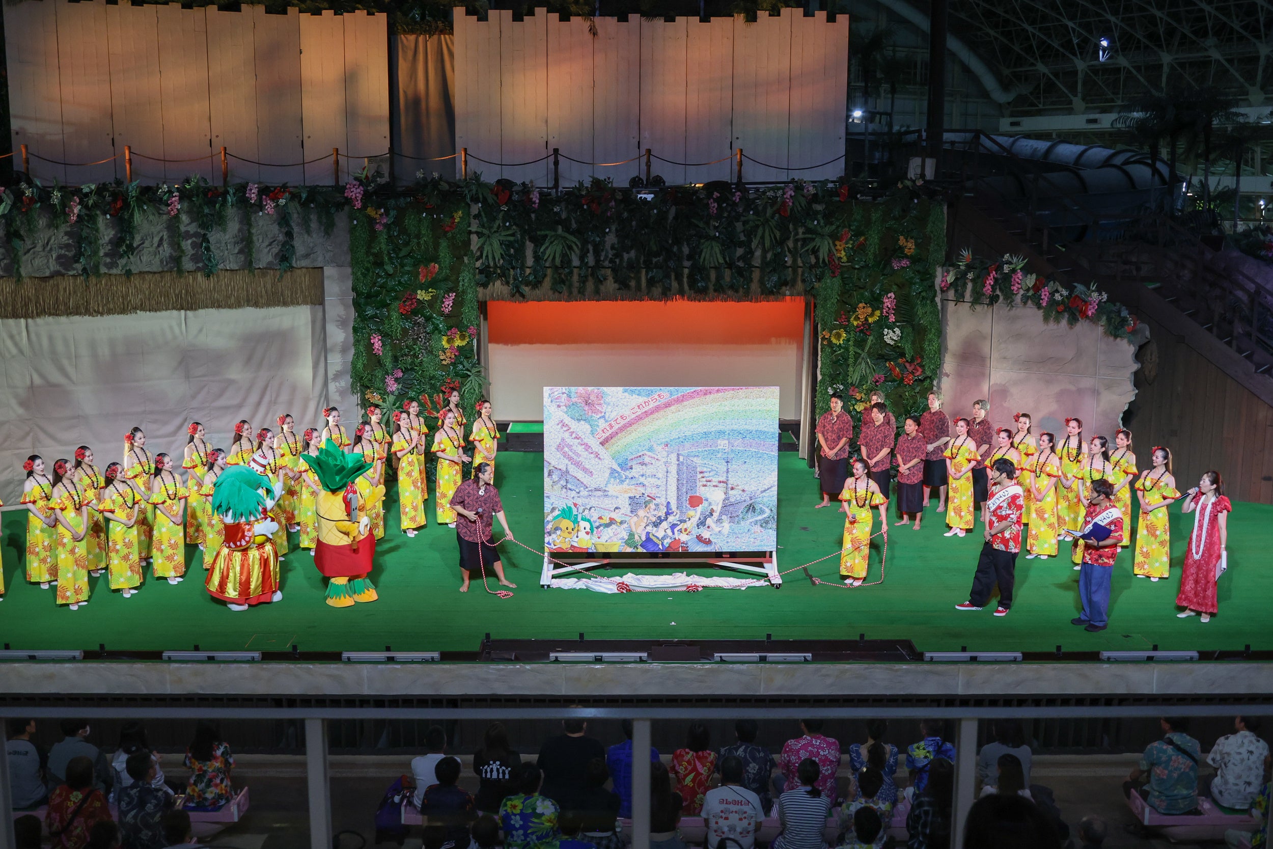 続いて、来場者から寄せられたハワイアンズでの思い出写真を使用した60周年記念モザイクアートの除幕式を実施。カウントダウンとともに幕が引かれると、ハワイアンズの歴史や未来への想いが詰まった作品が披露され、会場からは大きな拍手が送られました。「アルコ&ピース」の二人もモザイクアートを間近でみて思わず「うわ、すごい!」と感激し、平子さんは「絶対(地元の)知り合いいるからね!」と会場の笑いを誘いました。モザイクアートは、いわき市在住のイラストレーター・ユアサミズキ氏による制作で、翌日よりスプリングパーク3階通路に掲示されます。