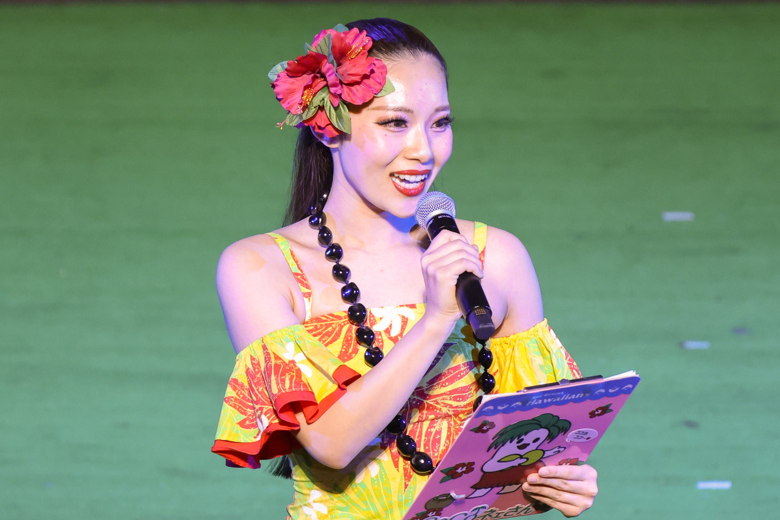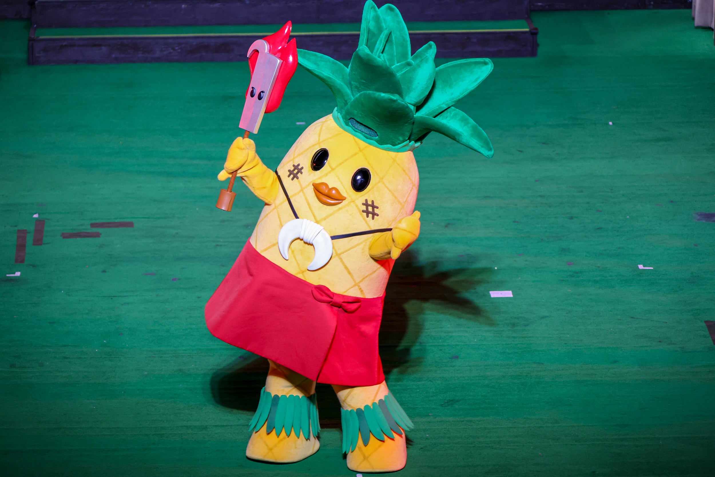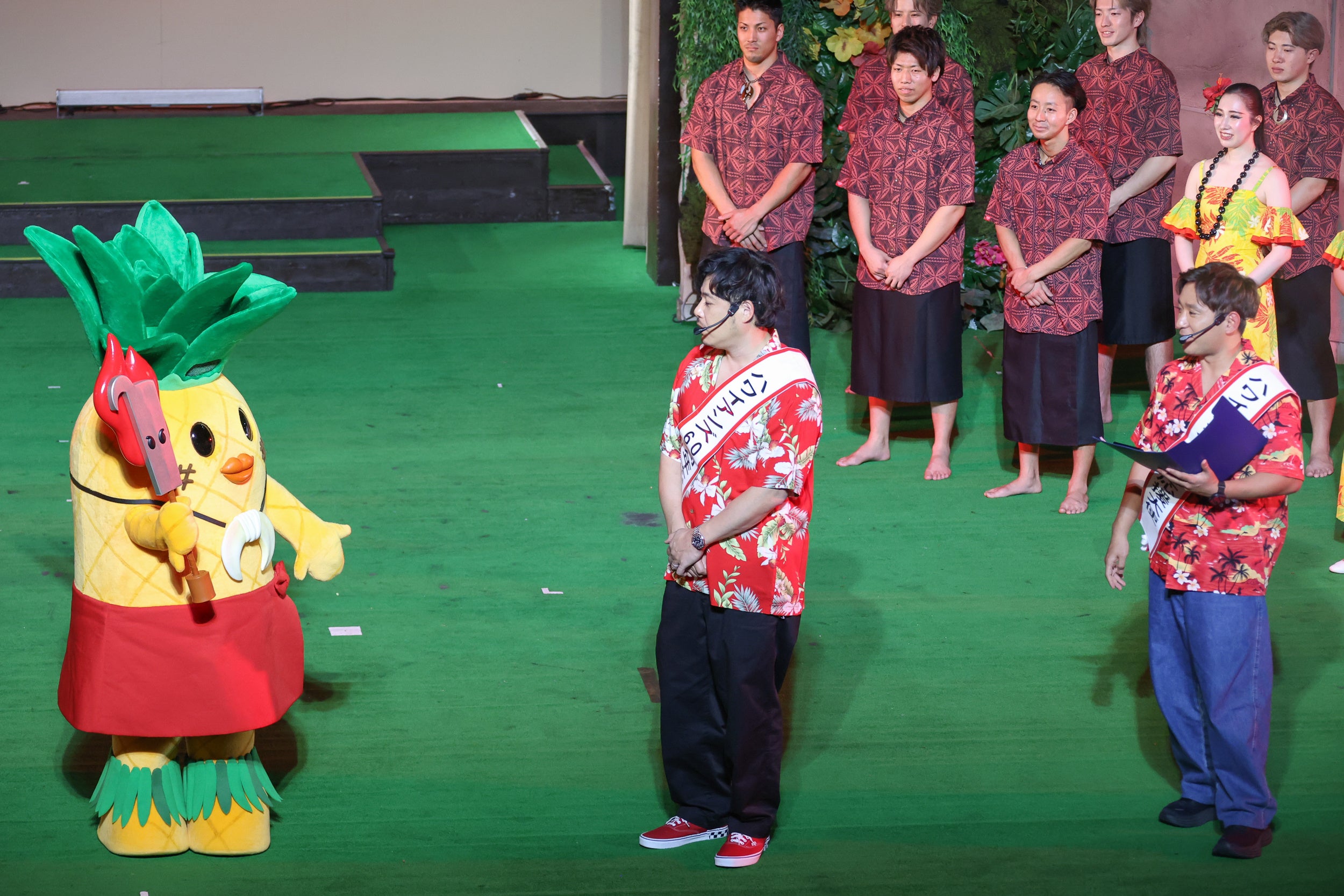 セレモニー中盤では、「アルコ&ピース」の呼び込みにより、60周年を記念した新キャラクター「パナシバくん」がステージに現れ、初お披露目となりました。ハワイアンズのオリジナルキャラクター「CoCoネェさん」の新たな仲間となる「パナシバくん」は、ファイヤーナイフダンスチーム「シバオラ」をイメージしたパイナップルの妖精です。シバオラメンバーとともに勇ましく登場し、その愛らしい姿に会場からは歓声が上がりました。「シバオラ」のジンLEONリーダーからは、パナシバくんの名前は「シバオラ」が相談して名付けたことや、「パナシバくん」は「シバオラ」に弟子入りしファイヤーナイフダンスを練習中でこれからデビューするかもしれないことが紹介され、今後の活躍に期待が寄せられました。
