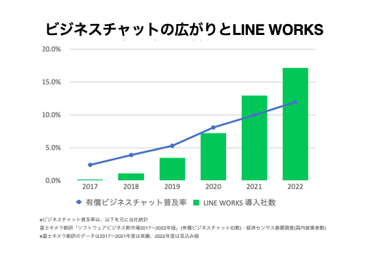 ※2:富士キメラ総研「ソフトウェアビジネス新市場2017〜2022年版」(有償ビジネスチャットID数)と経済センサス基礎調査(国内就業者数)を基にワークスモバイルジャパンが推計