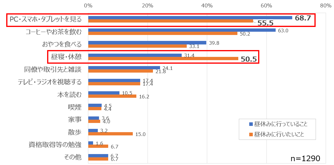 ・休憩時に行いたいことの2位は「昼寝・休憩」だが、休憩時に行っていることとしては、4位に留まる