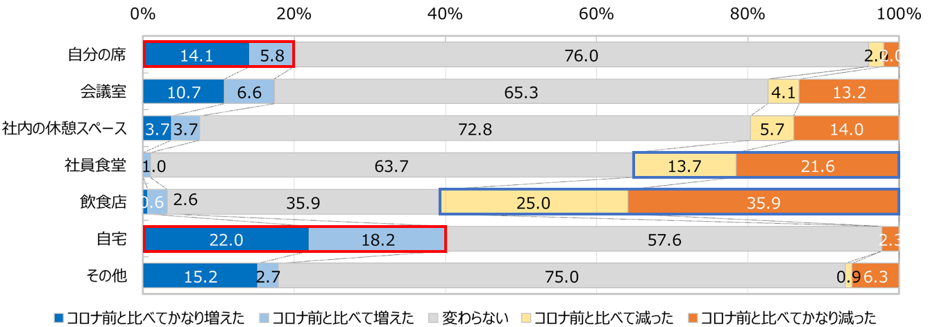 ・職場内での食事場所は「自席」が増えた一方、「社員食堂」の利用が減っている