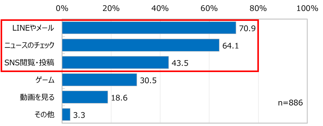 次いで、「ニュースのチェック」で64.1%、「SNS閲覧・投稿」が43.5%と続く