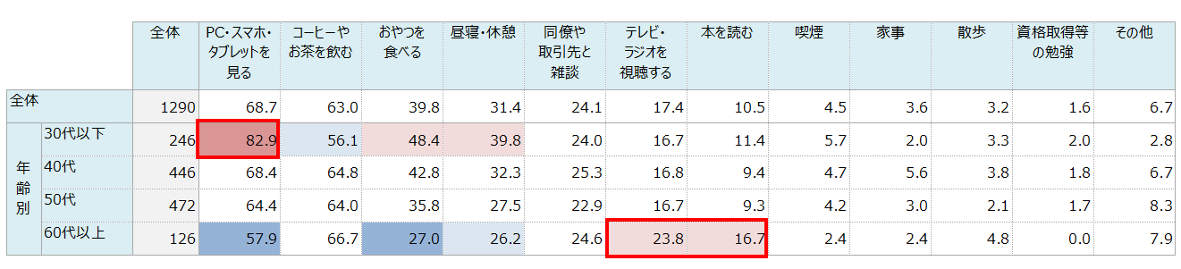 ・休憩時に行っていること、行いたいこと共に「PC・スマホ・タブレットを見る」が最も多い