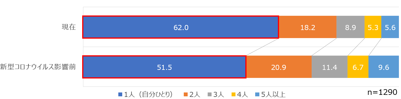 ・コロナ影響前と比較して、「1人」で食べる人は約1割増加している