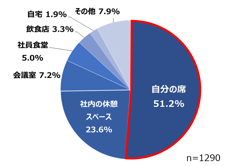 ・ランチを食べる場所は、「自席」が51.2%と最も高く、次いで「休憩スペース」が23.6%