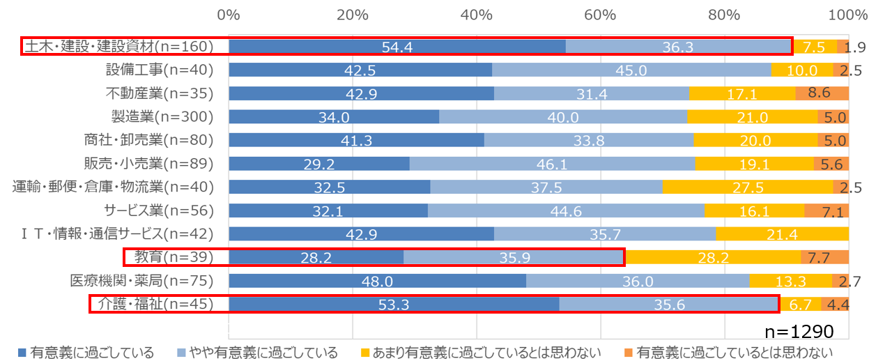 ・「土木・建設」「介護・福祉」は休憩時間の満足度が高く、「教育」は、休憩時間の満足度が低い傾向が見られた
