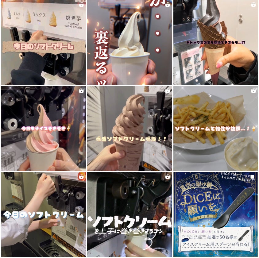 投稿内容は“ソフトクリームに全振り“「DiCE」の公式インスタグラムです。当インスタグラムのブランディングは「とにかくソフトクリームに本気になる」そこで、ネットカフェのアカウントでありながら、店舗情報の詳細や設備アピールは一切行わず、映えのあるソフトクリームの発信に全振りして運用しています。DiCEでは毎週入れ替わるソフトクリームが店内利用中は食べ放題。