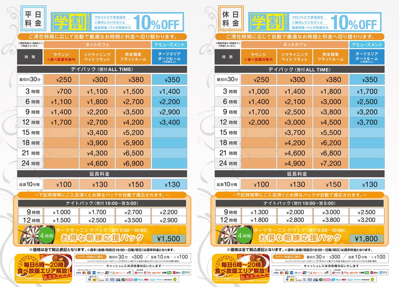 学生証をご提示いただくと、平日休日ともにパック料金・延長料金から10%が割引になります。