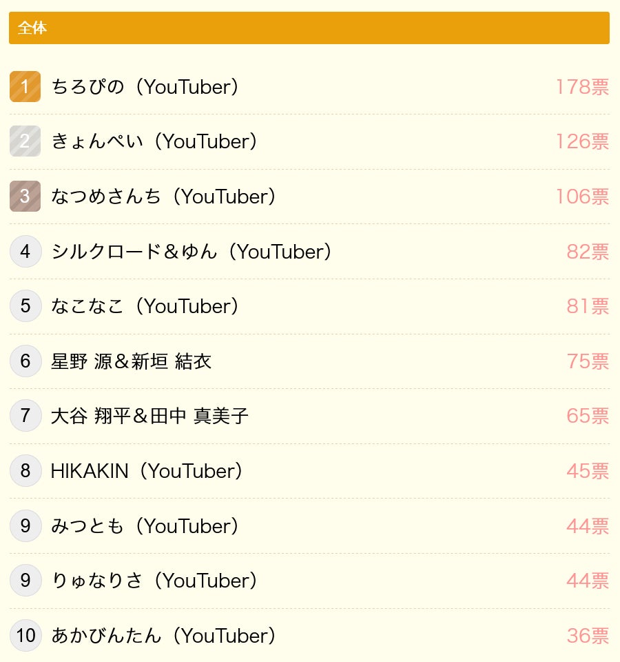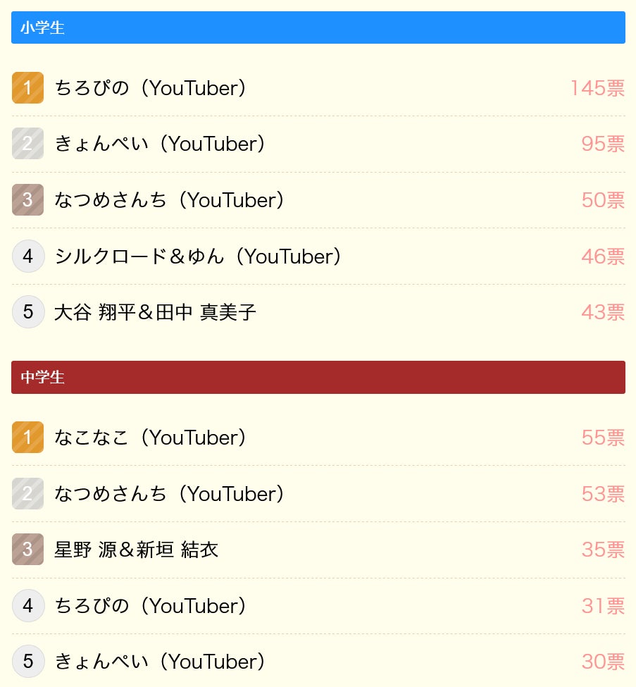 小学生のランキングでは、小学生から絶大な人気を集めているカップルYouTuberの「ちろぴの」、中学生のランキングでは同じくカップルYouTuberの「なこなこ」が1位にランクインしました。