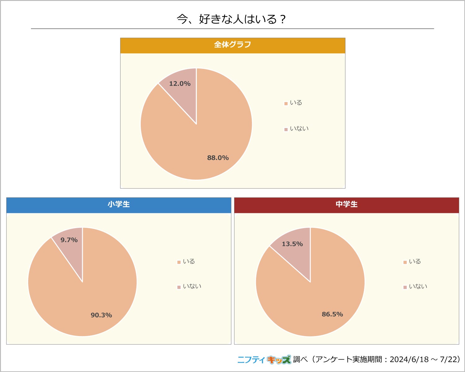 好きな人が「いる」人は、88%でした。小学生では9割を超えています。