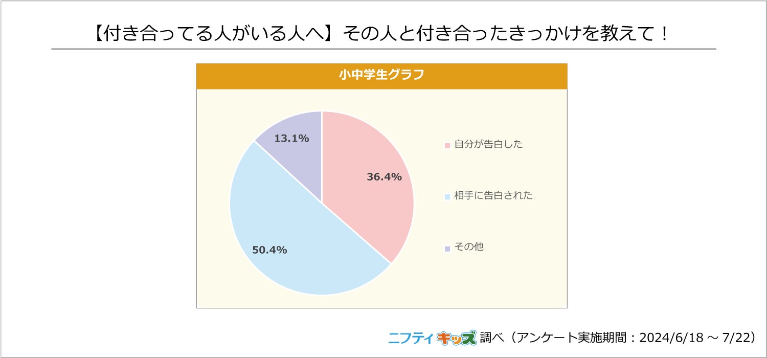 付き合ったきっかけは「相手に告白された」ケースが半数を占めました。その他には「お互い同時に告白した」「気づいたら付き合っていた」などがありました。