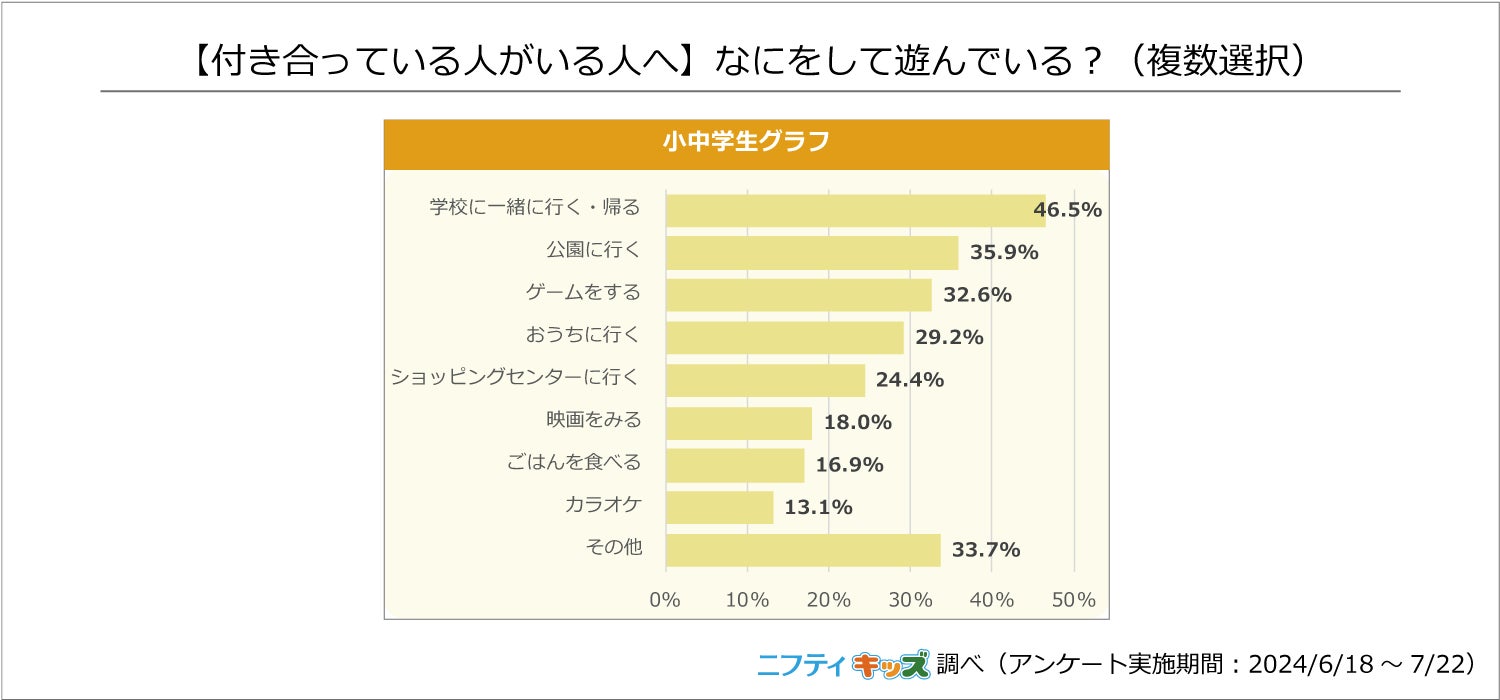 付き合っている人との過ごし方では、約半分の46.5%が「学校に一緒に行く・帰る」と回答しました。