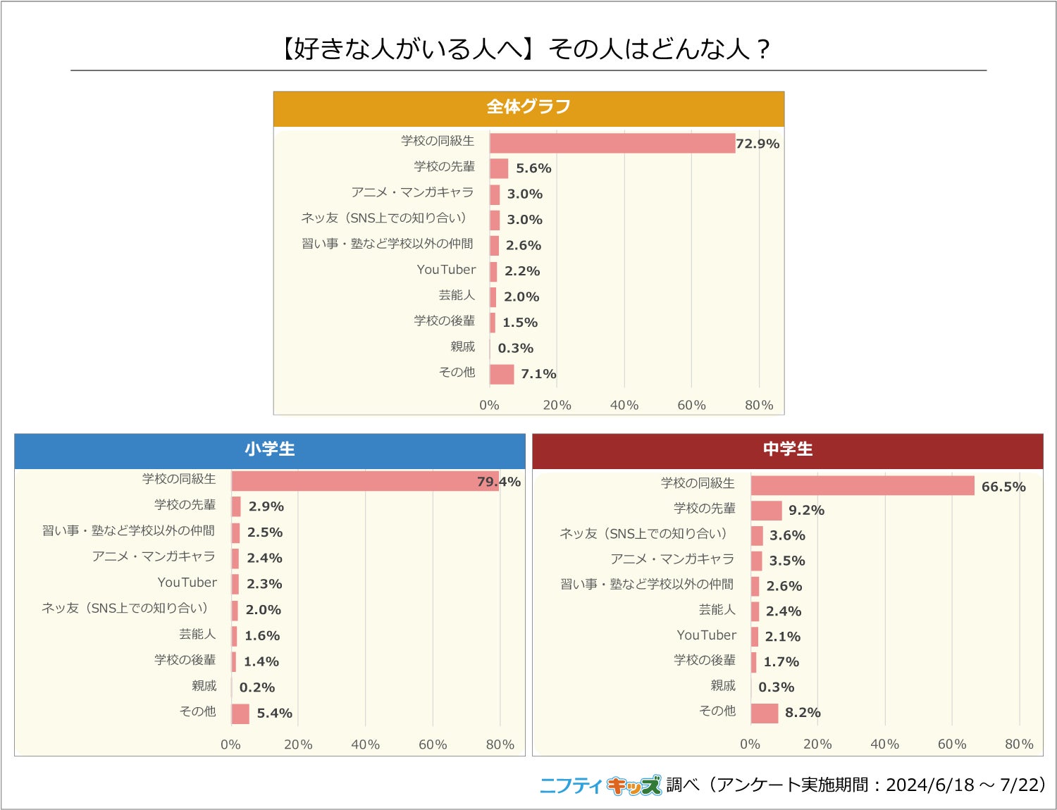 また、好きな相手は同じ学校の生徒が多く、中でも「同級生」が全体の約7割を占める結果となりました。好きになったきっかけは「同じクラスや班になった」「可愛いや好きと言ってくれた」「優しい言葉をかけてくれた」など、さまざまな理由があげられています。