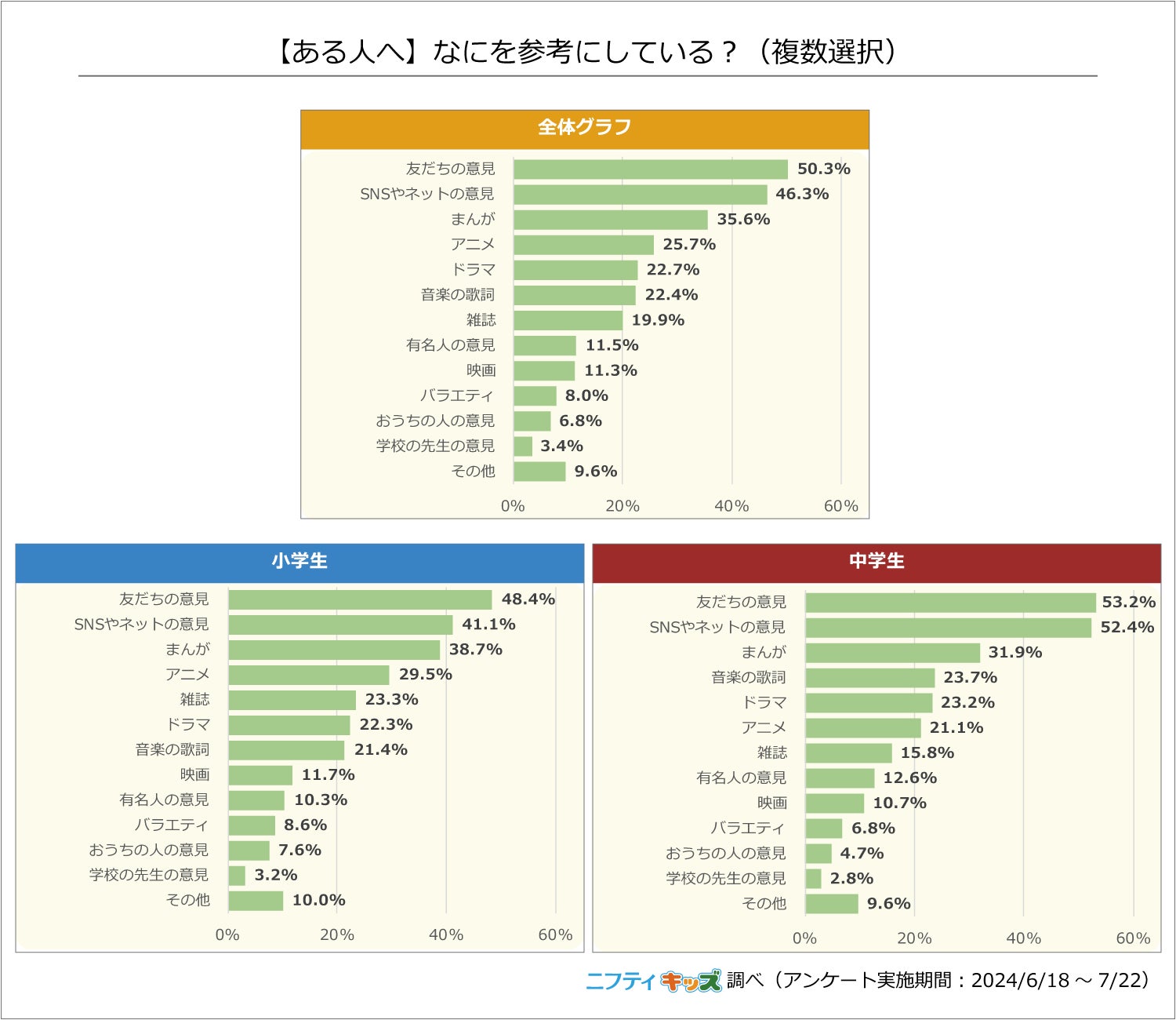 小中学生どちらも「友だちの意見」が1位でした。僅差で「SNSやネットの意見」が選ばれています。身近な存在である「友だち」と、不特定多数の意見が集まる「SNSやネット」の両方を参考にしながら恋愛していることがわかりました。