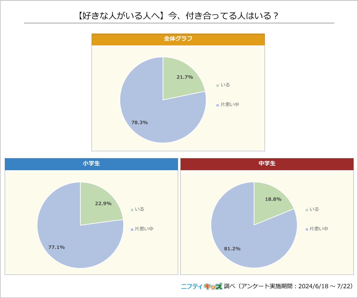 好きな人がいる人の中で、今付き合っている人が「いる」と回答した人は小学生で22.9%、中学生で18.8%でした。好きな人がいる人の割合と同様、小学生がやや上回る結果となりました。