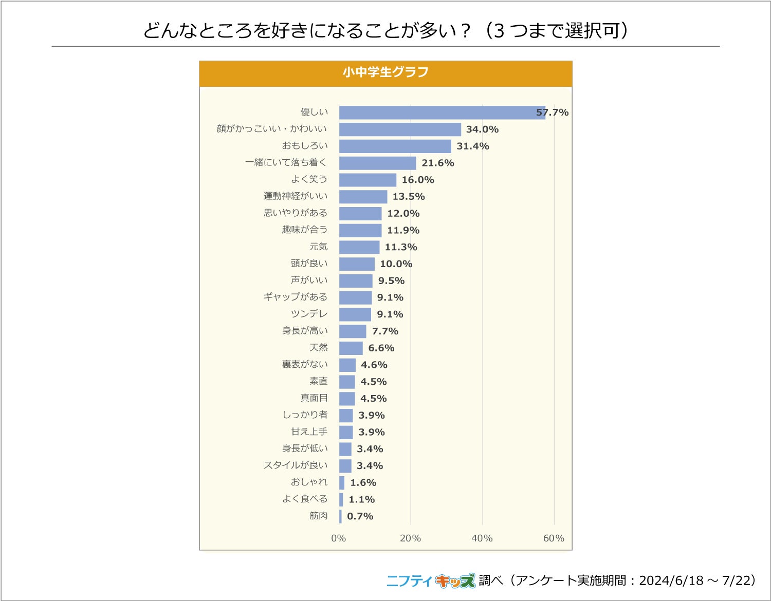 相手のどんなところを好きになるかという質問では、57.7%の子どもたちが「優しい」を選択し、「顔がかっこいいまたはかわいい」「おもしろい」などの要素を上回る結果となりました。