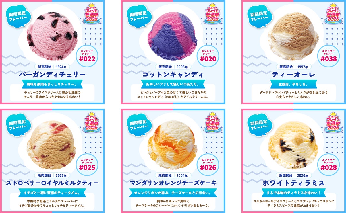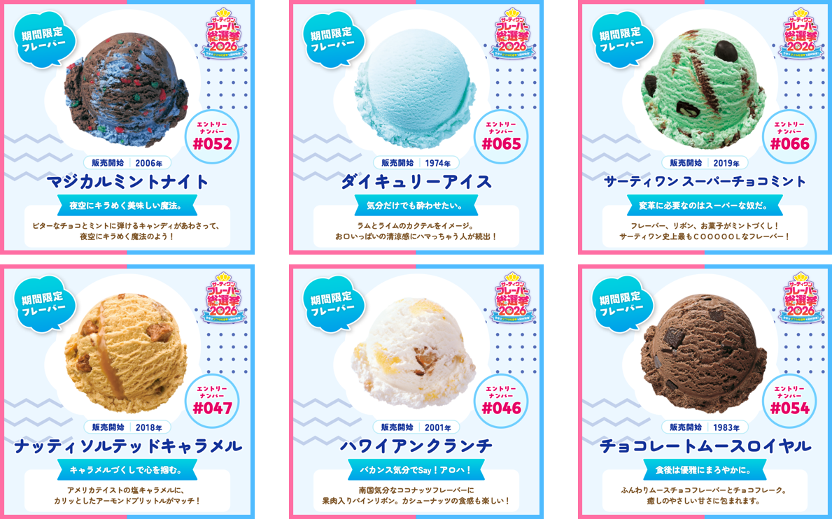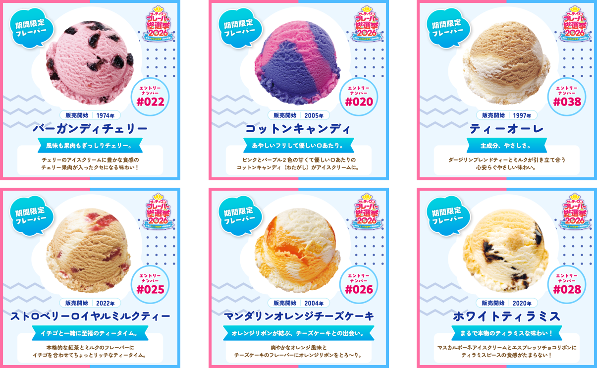 B-R サーティワン アイスクリーム株式会社(所在:東京都品川区上大崎3-1-1/代表取締役会長兼社長 CEO ジョン・キム:東京証券取引所(スタンダード市場):2268)は、2026年4月2日(木)から4月30日(木)まで、「サーティワン フレーバー総選挙2026」を開催します。