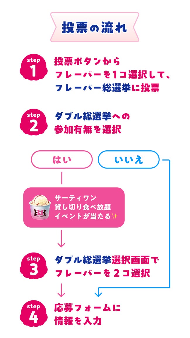 投票は期間中毎日1回可能です。選挙公約として、オリジナルデザイングッズのプレゼントや、期間限定フレーバーの復刻も予定しています。また投票していただいた方には抽選で、「サーティワン貸し切り食べ放題イベント」があたります!あなたの“推しフレーバー”や“お気に入りダブル”に、ぜひ毎日1回投票してください。